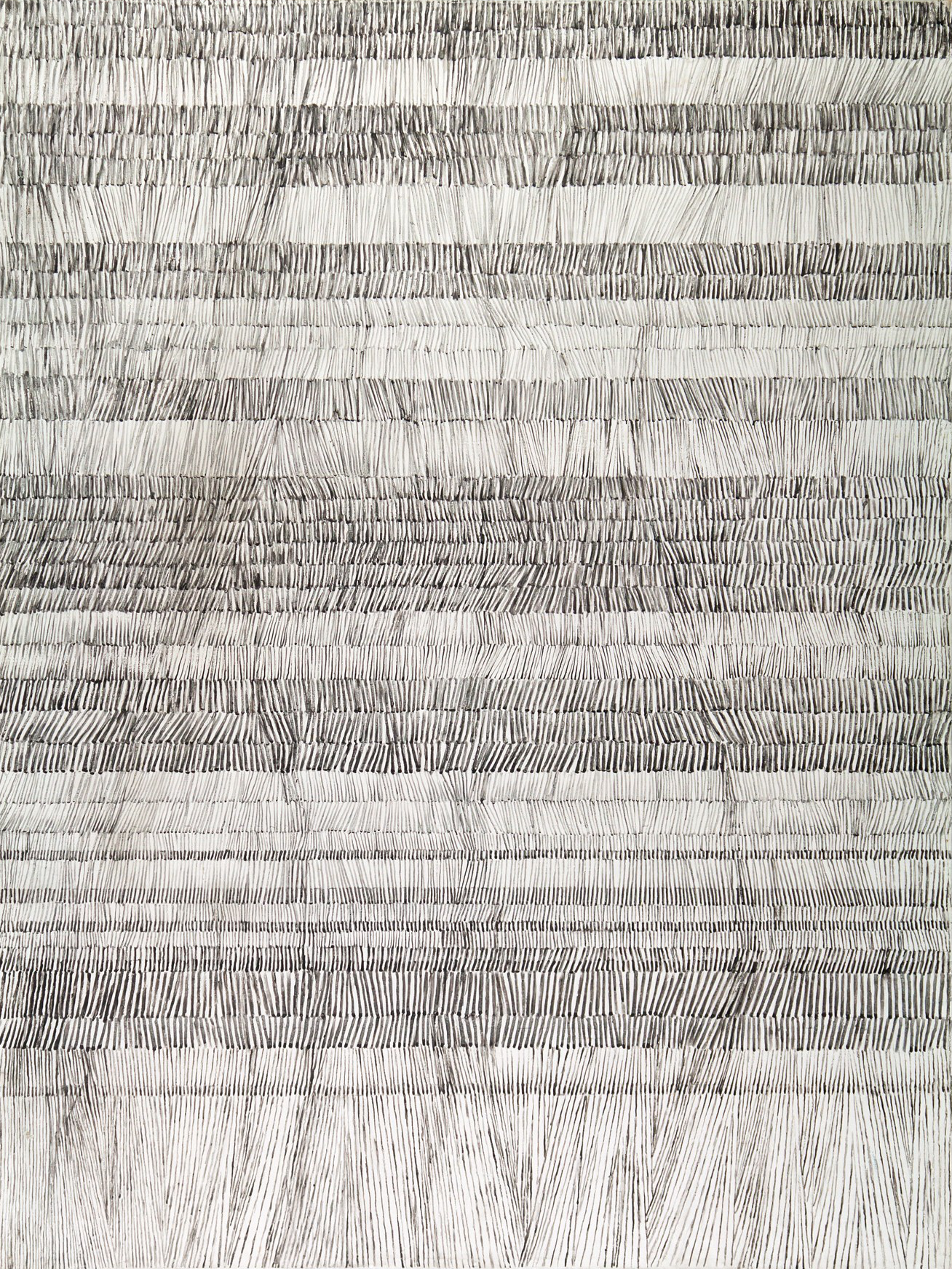 Abstrakcja imitująca zapis tekstowy. Linijki składają się z mnóstwa swobodnych kreseczek, z których każda została wyrwana z trochę innego ruchu. Powstał język oparty na niuansach ekspresji.
