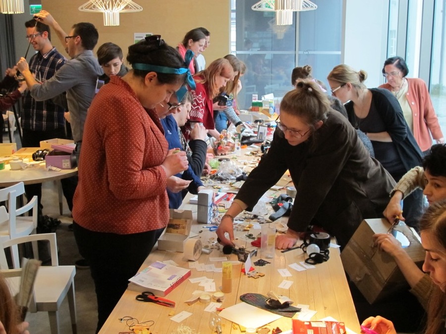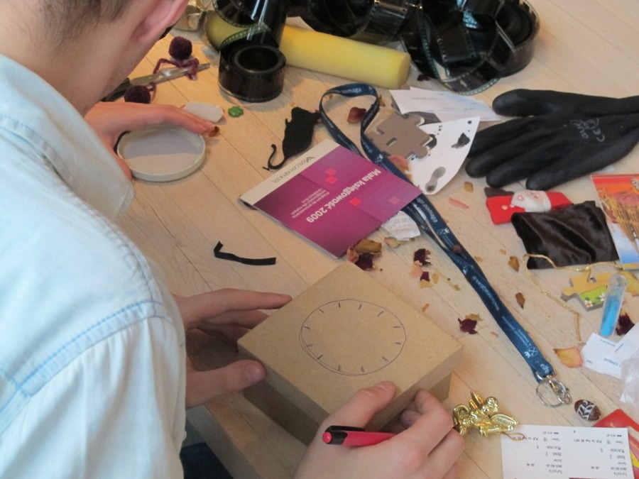 Całodzienne święto artystycznych praktyk rozpoczęły warsztaty w muzealnej kawiarni i Bibliotece. Zajęcia Zabawy z książką: fluxsłowa, fluxksiążki, fluxpudełka w kawiarni MOCAK-u prowadzone były przez Klaudię Rachubińską i Magdalenę Mazik i dotyczyły roli tekstu w pracach Fluxusu. Każdy z uczestników, pracując na swoim egzemplarzu książki Grupy ETC tworzył własne partytury lektury i nanosił poprawki na propozycje autorów. Równolegle w Bibliotece MOCAK-u odbywał się warsztaty kodowania informacji prowadzone przez Mateusza Felczaka. Ich uczestnicy ćwiczyli się w przechodzeniu od działań performatywnych do interakcji z systemami komputerowymi. Następnie wspólnie tworzyliśmy fluxpudełka – złożone z codziennych przedmiotów kompozycje, które można traktować jak „poematy do dotykania” (tzw. poezja haptyczna).