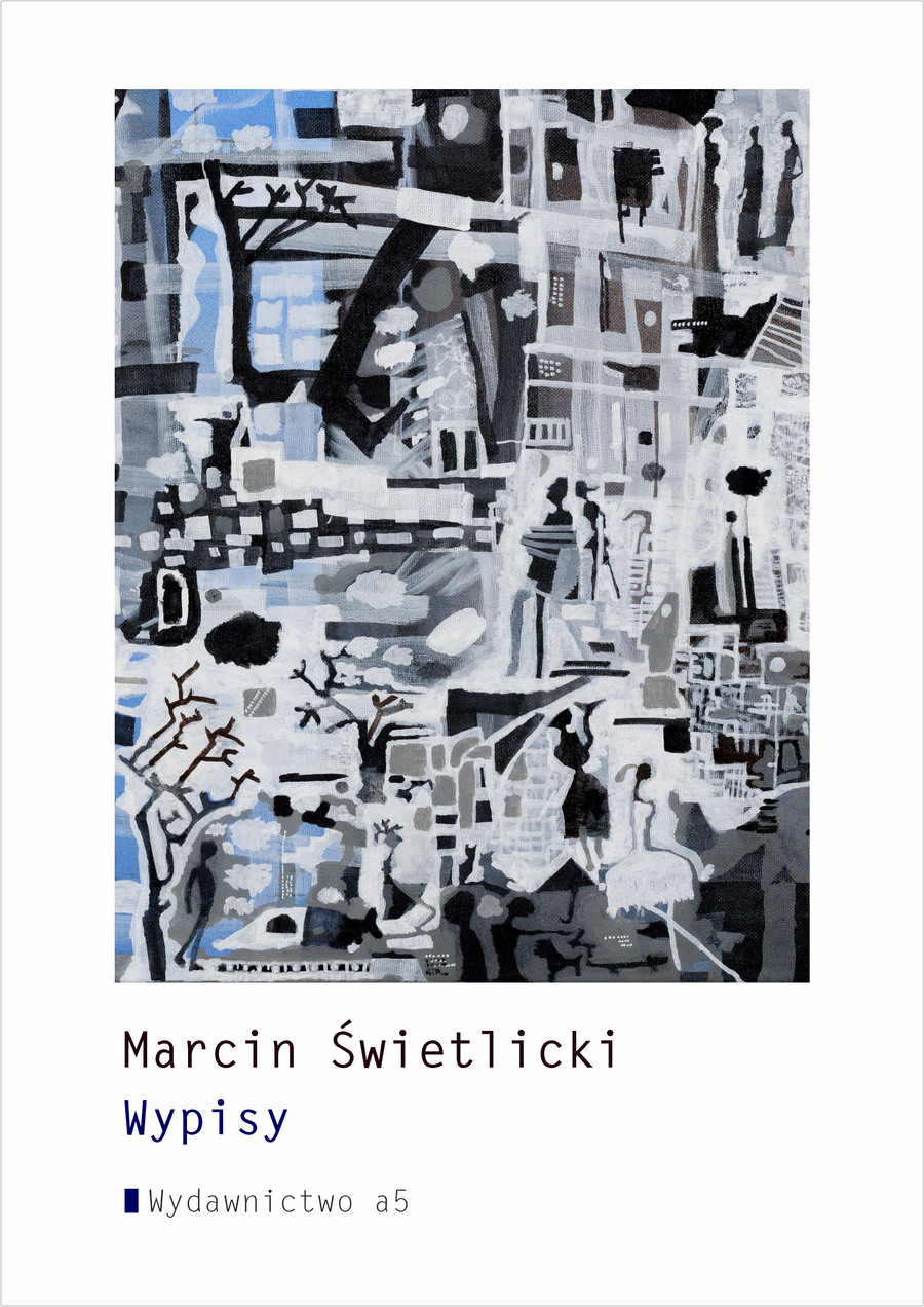 1996, 2006, 2016, 2026 – raz na dziesięć lat Marcin Świetlicki wydaje książkę w Bibliotece Poetyckiej Wydawnictwa a5. Po „Trzeciej połowie”, „Muzyce środka”, „Drobnej zmianie” przyszła kolej na „Wypisy”. Za każdym razem są to książki znakomite: demaskują, niepokoją, intrygują. Nie pozostawiają czytelnika obojętnym, przypominając że Marcin Świetlicki jest jednym z najbardziej przenikliwych, ale również czułych obserwatorów rzeczywistości. Tym razem w połowie drogi miedzy wierszem a piosenką, niepowtarzalny rytm poezji Świetlickiego wciąga czytelnika w intymny świat autora.