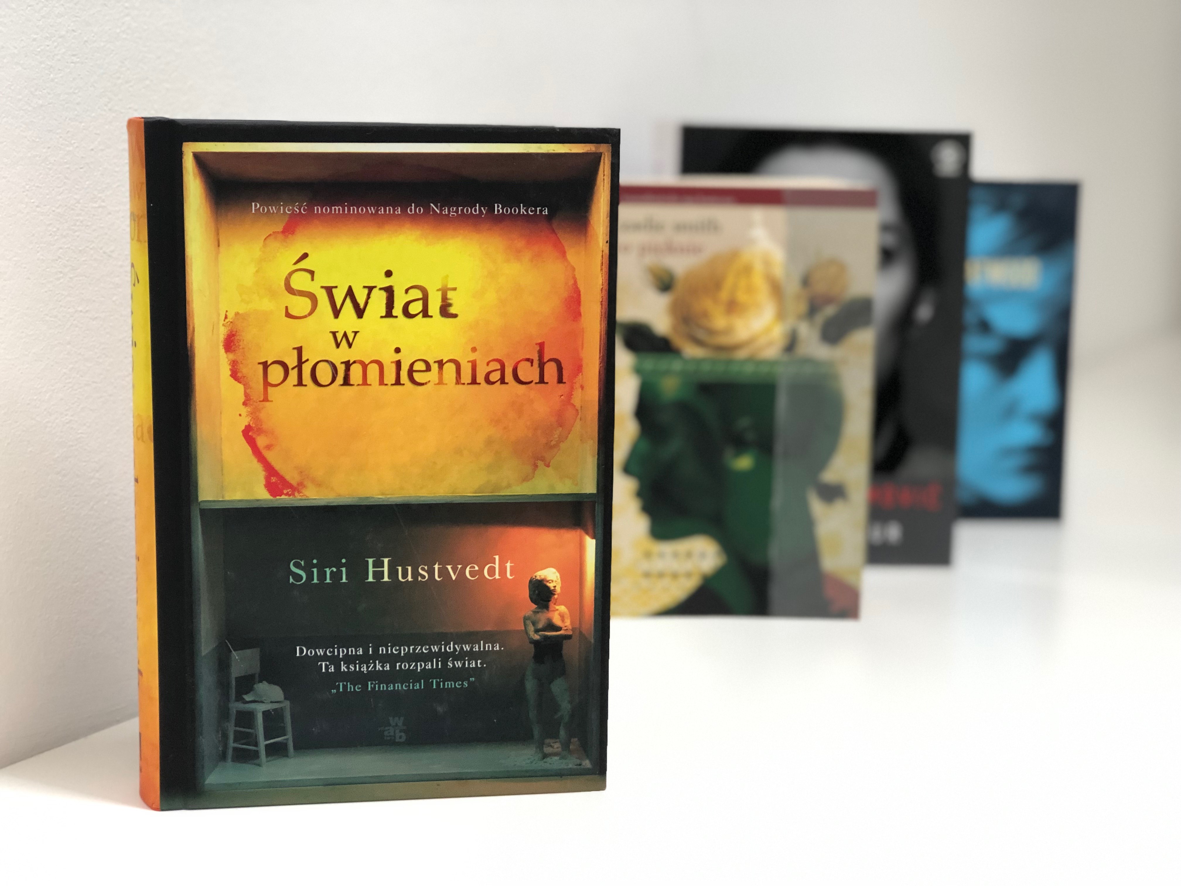 Tytułowy Świat w płomieniach to nazwa jednej z najważniejszych prac Harriet Burden – artystki i filozofki sztuki, której dorobek przez lata prezentowany był pod męskimi pseudonimami. Powieść Siri Hustvedt składa się z postronnych relacji o artystce: wywiadów, listów, recenzji wystaw oraz fragmentów osobliwego pamiętnika Burden. Zeszyty nazwane kolejnymi literami alfabetu odsłaniają kulisy intelektualnego eksperymentu przeprowadzonego w świecie sztuki, poświęconego znaczeniu płci i wszechobecnej dyscyplinie patriarchatu. Książka prezentuje wielogłos opinii o sensacyjnym oszustwie spod znaku Jorge’a Luisa Borgesa i Fernanda Pessoi, pełna jest opisów nieistniejących, misternie zbudowanych instalacji, rzeźb i obrazów oraz prezentuje szerokie pole skomplikowanych, a często również fikcyjnych odniesień.
